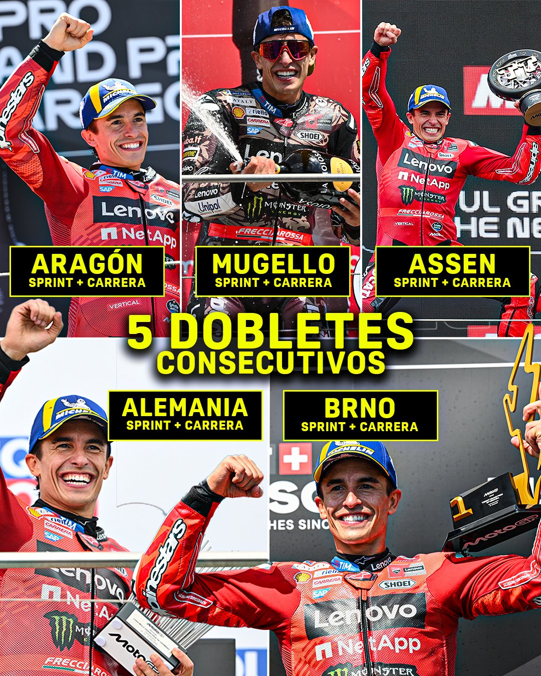 兩者的差距很大。Bagnaia讓Pedro Acosta超越後被拉開了至少十公尺的距離;反觀當Marc讓Acosta超過他時早已開始加速,與對手保持了僅一至兩公尺的距離。這不僅讓他的前輪更快升溫,也讓他守住了位置,而Bagnaia則立即被Enea Bastianini和Fabio Quartararo超越。